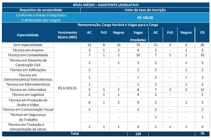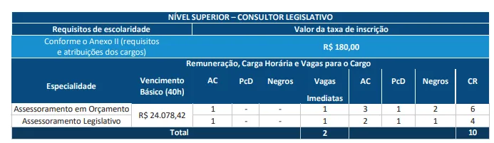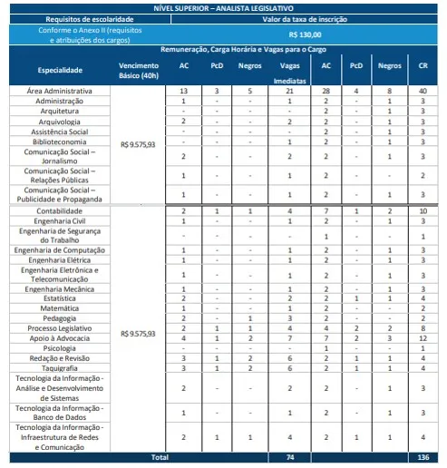 Analista Legislativo (nível superior): salário de R$ 9,5 mil em áreas como Administração, Arquitetura, Contabilidade, Engenharia, Comunicação Social, Biblioteconomia, Serviço Social, Tecnologia da Informação, entre outras.