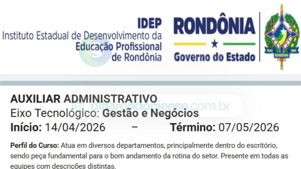 O Governo do Estado de Rondônia abriu inscrições para cursos de qualificação profissional voltados à população do Vale do Guaporé. A iniciativa oferece formação gratuita na modalidade remota, com início previsto para o dia 14 de abril de 2026.